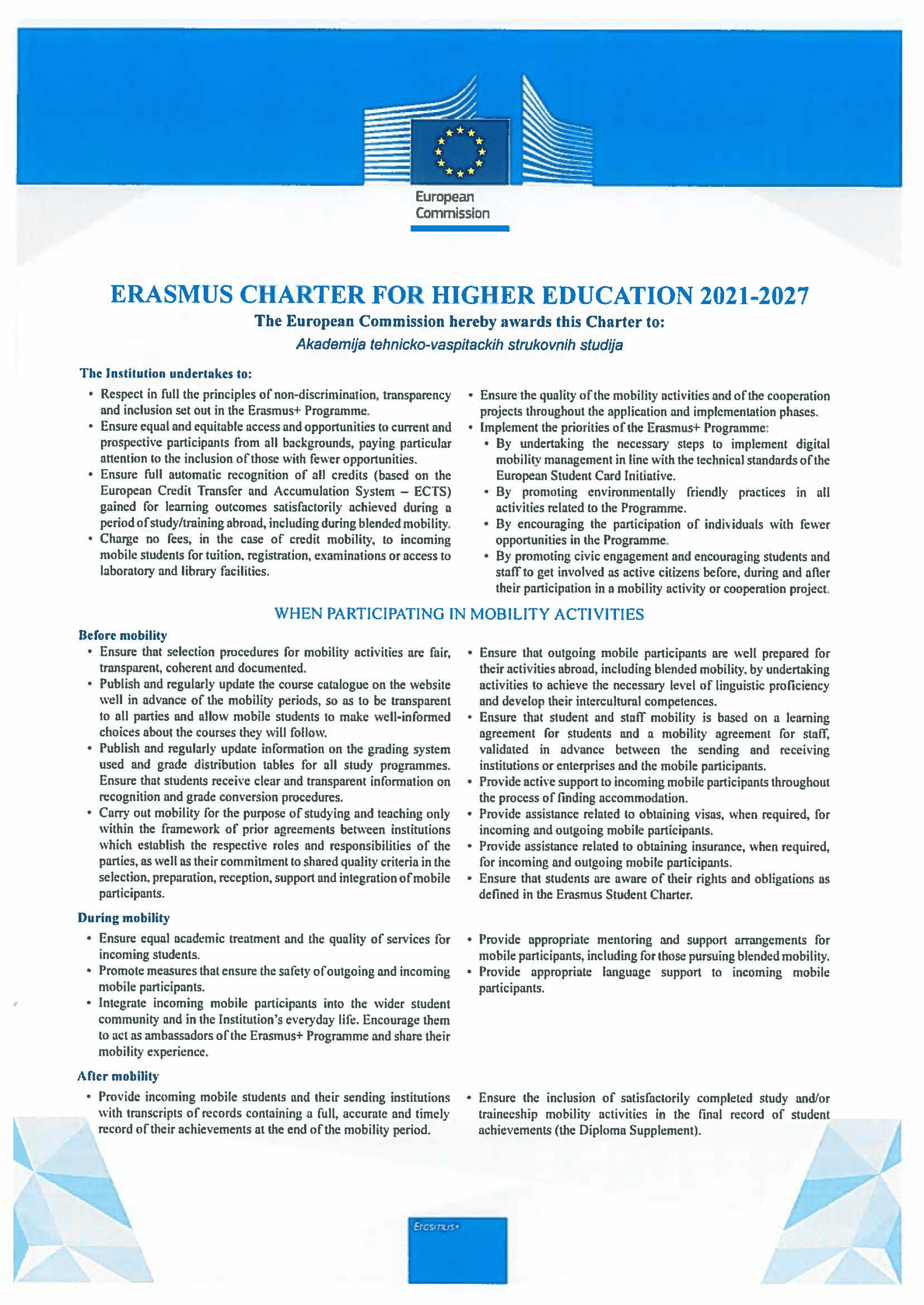 Erasmus Charter for Higher Education is a document based on which the European Commission awards accreditation to higher education institutions from program countries thanks to which they can compete for Erasmus + program projects and take part in them. It contains the basic principles that higher education institutions have to comply with in order to be able to take part in the Program. Also, Erasmus charter offers the basic quality framework for European and international cooperation.